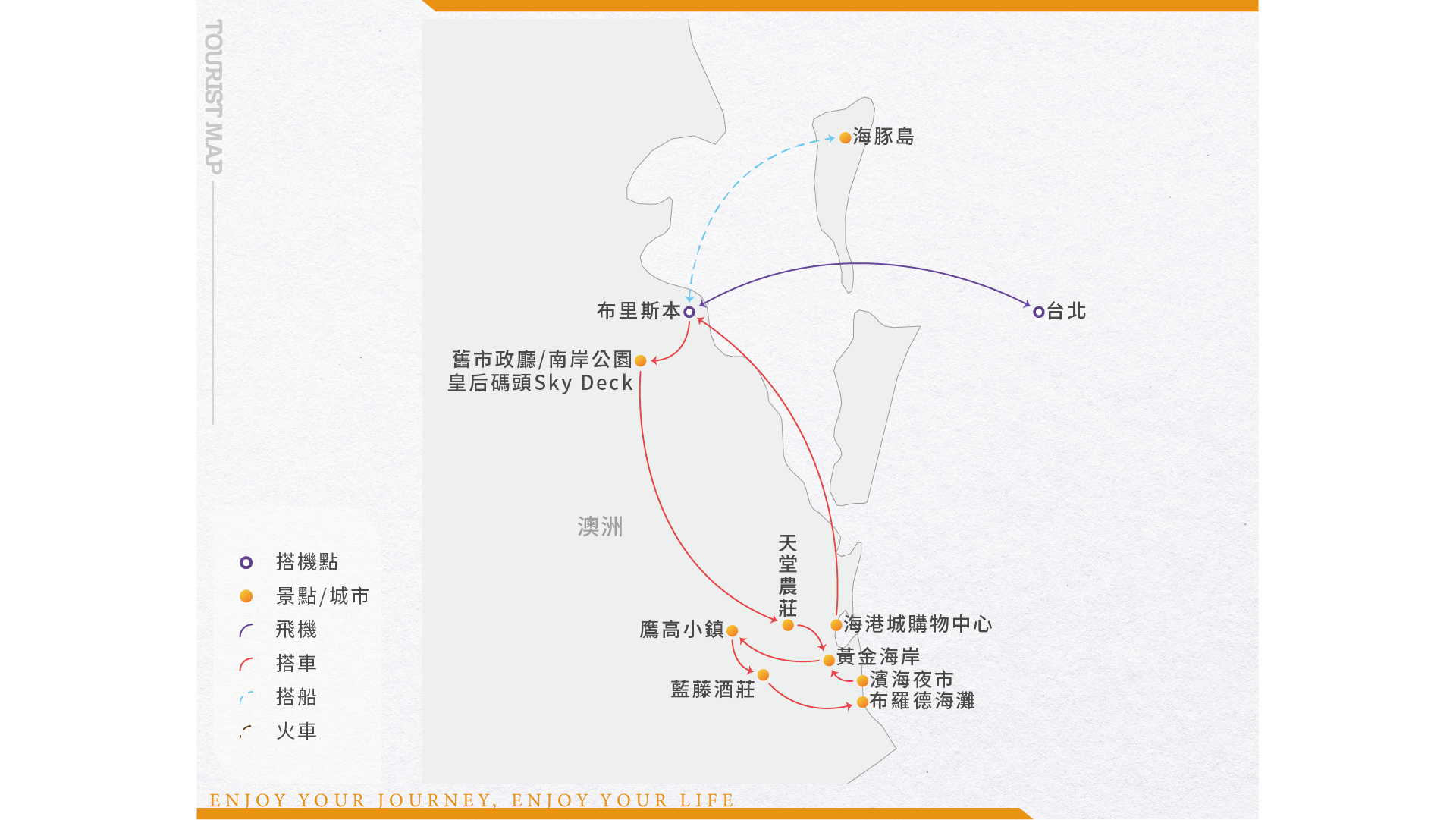 安排許久的假期即將到來,帶著為這次行程準備行囊出發前往國際機場,今日集合於台灣桃園國際機場,辦理出境手續後,搭乘豪華客機直飛澳洲第三大城也是昆士蘭省首府的布里斯本。享受著機上的影音設備,有許多影片可選擇可觀看,今晚好好休息,補充體力,迎接明日開始的精彩澳洲之行!