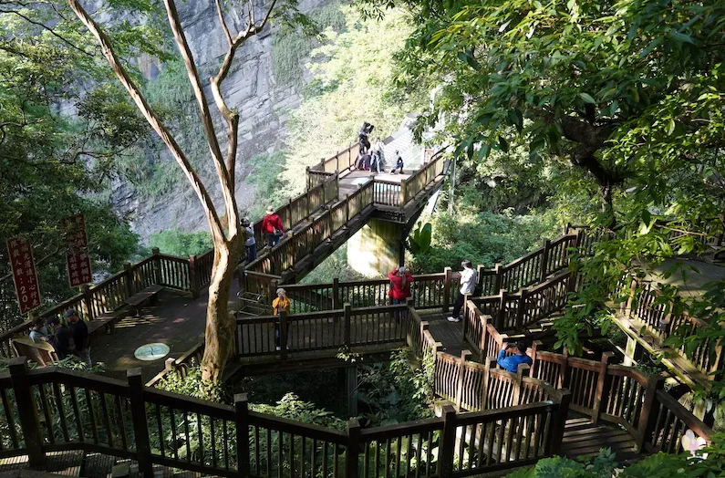 漫步玻璃步道,俯瞰峽谷溪流景色。