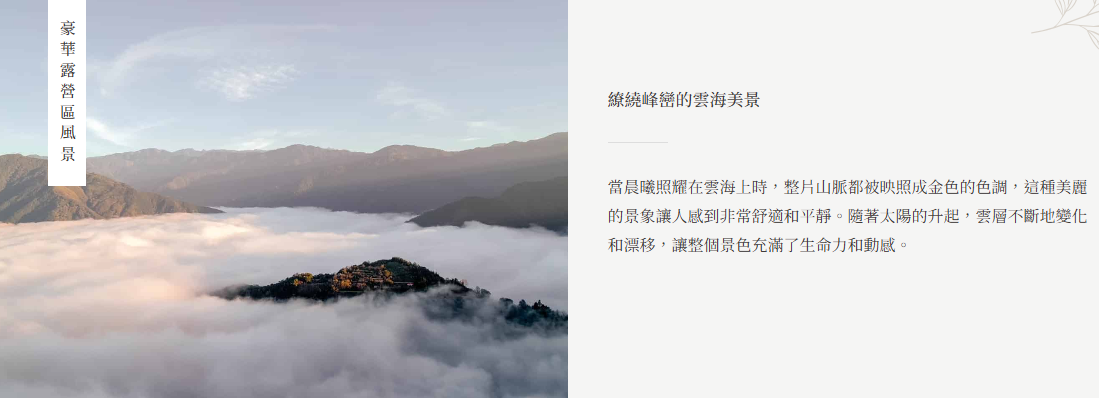 位在海拔1200公尺之上的「霧語 WooYuu」因地形優勢,非常容易可以看到壯闊的雲海景象園區時常被霧氣環繞,如同蓋上一層薄紗,遠眺望不穿,近看才見其美麗的樣貌開著車穿過蜿蜒的山路,遠離都市所帶來的壓力、煩擾靜謐地在雲海之上聆聽山與雲之間的對話在一泊二食的住宿體驗中充分感受到自然的美妙以及當地風情的獨特!