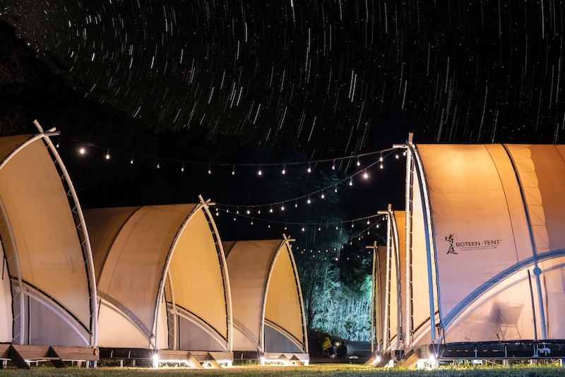 房型介紹:安排【山峰小徑】帳區,採用蟬說獨特的大帆船帳,內部寬敞高挑,有木地板、沙發、茶几、雙人床,設備齊全,晚上滿天星斗。