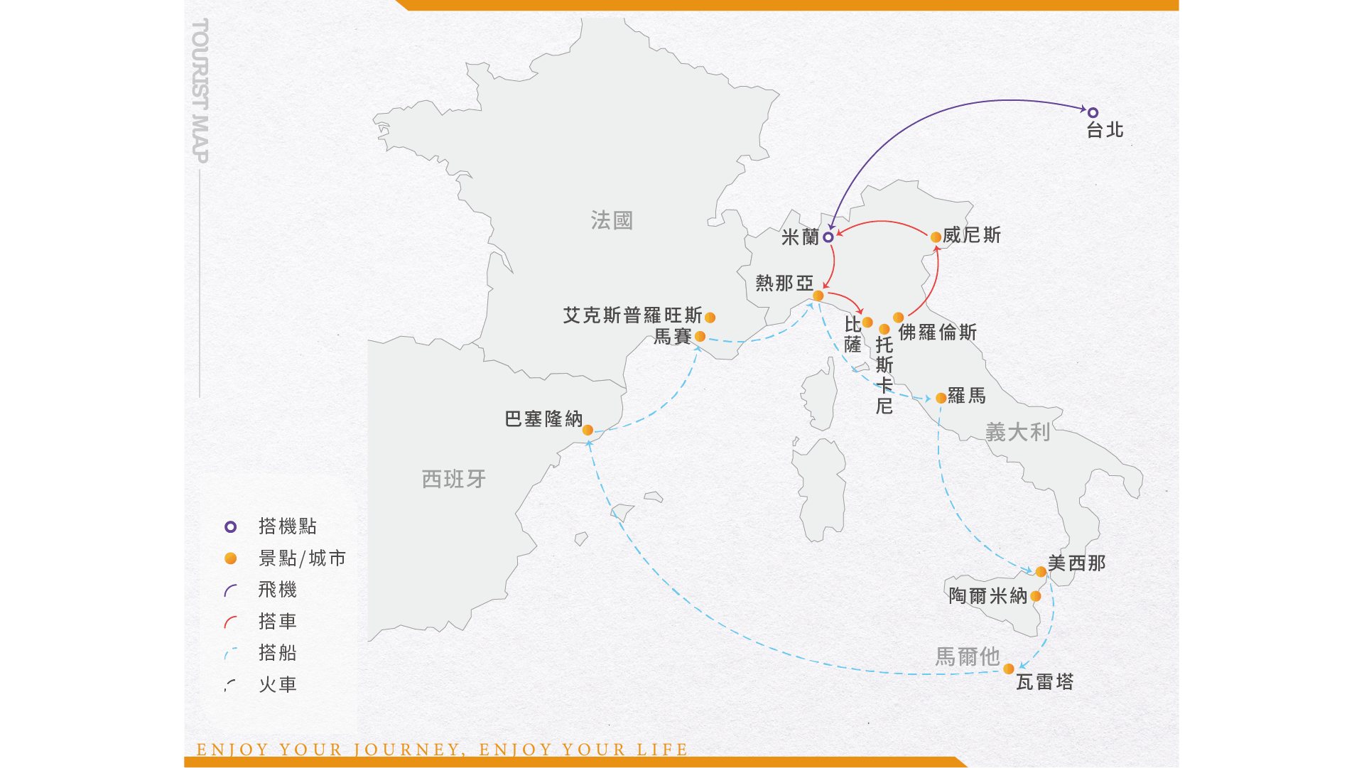 今日帶著快樂的行囊,奔向熱情又浪漫的義大利。南北狹長像靴子一樣的義大利,曾是羅馬帝國的所在地,在政治、藝術和建築上皆為後代留下不少豐功偉業。中古世紀時的文藝復興在此萌芽,米開朗基羅等大師在此地留下相當多的藝術瑰寶。今日於飛機上稍適休息,於隔日迎接美麗的旅程。