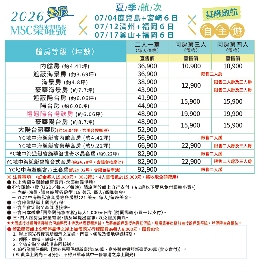 ※ 本商品性質為自由行,恕無領隊隨程服務,船上所有服務皆由地中海郵輪-榮耀號提供。