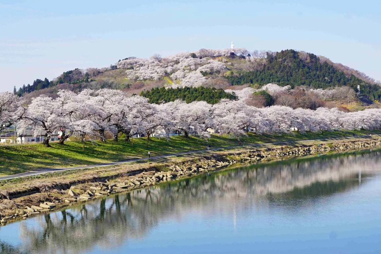 【一目千本櫻】綿延約8公里長,流經大河原町的白石川堤是賞櫻的名勝景點。包含樹齡80幾年的櫻花樹與染井吉野櫻等等,這裡約種植1,200棵櫻花樹。配合著開花時期,每年會舉辦大河原櫻花祭。搭乘人力車或屋形船,特別能感受到春神降臨的感覺。殘雪未融的藏王連峰與近看櫻花綻放出的優美景色,在夜間點燈時的光景格外地奇幻動人。