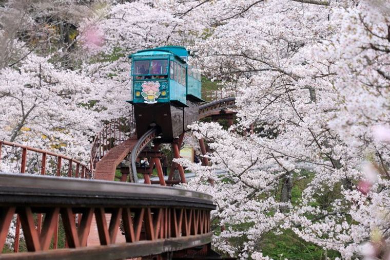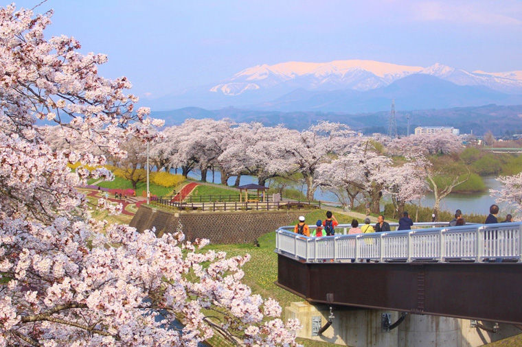 【船岡城址公園】是宮城縣唯一被選定為「櫻花名勝100選」的地方,盛開時滿山都被染成櫻色,與24公尺高的「船岡和平觀音」平齊視線、共望遠方,身旁櫻粉燦爛,令人不禁身心舒暢。穿過公園中橫跨於鐵軌之上的橋,迎面而來的是河畔幾乎無邊無際的爛漫櫻花。