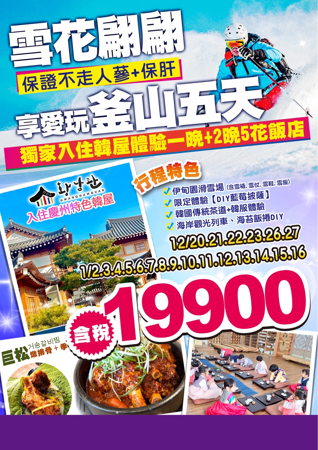 3. 本行程恕不接受韓籍旅客及其家屬參團;當地參團須提供來回電子機票,恕不接受於韓國打工度假及工作者參團。